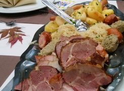キャベツを千切りにした漬物と一緒に、数種類のソーセージ、数種類の部位の豚肉、特に腿肉をキャベツにのせて蒸し焼きにしたもの。現在では、アルザス地方の他、ドイツ・ポーランドなど北欧・東欧諸国、ロシア、アメリカ合衆国、中国などでもよく食べられています。
